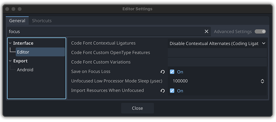 Below are the recommended settings for configuring the Godot editor for optimal integration with Neovim as your external editor. To access these settings, make sure that the Advanced Settings switch is enabled at the top of the Editor Settings dialog.